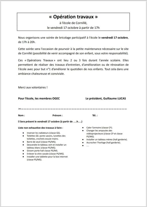 Votre enfant a reçu dans son cartable un coupon pour la soirée "petits travaux" qui aura lieu vendredi 17 octobre à partir de 17h. Nous avons absolument besoin de votre aide pour aider à l'entretien de l'école. Alors que vous soyez artisan ou bricoleur du dimanche, venez donner un peu de votre temps et de vos compétences pour nous aider. Remplissez le coupon réponse et retournez le à l'école. Merci