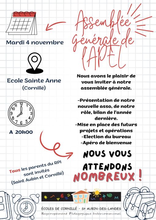 L'APEL du RPI Cornillé/St Aubin des Landes est ravie de vous convier à son assemblée générale, qui aura lieu le mardi 4 novembre, à 20h, sur le site de Cornillé.